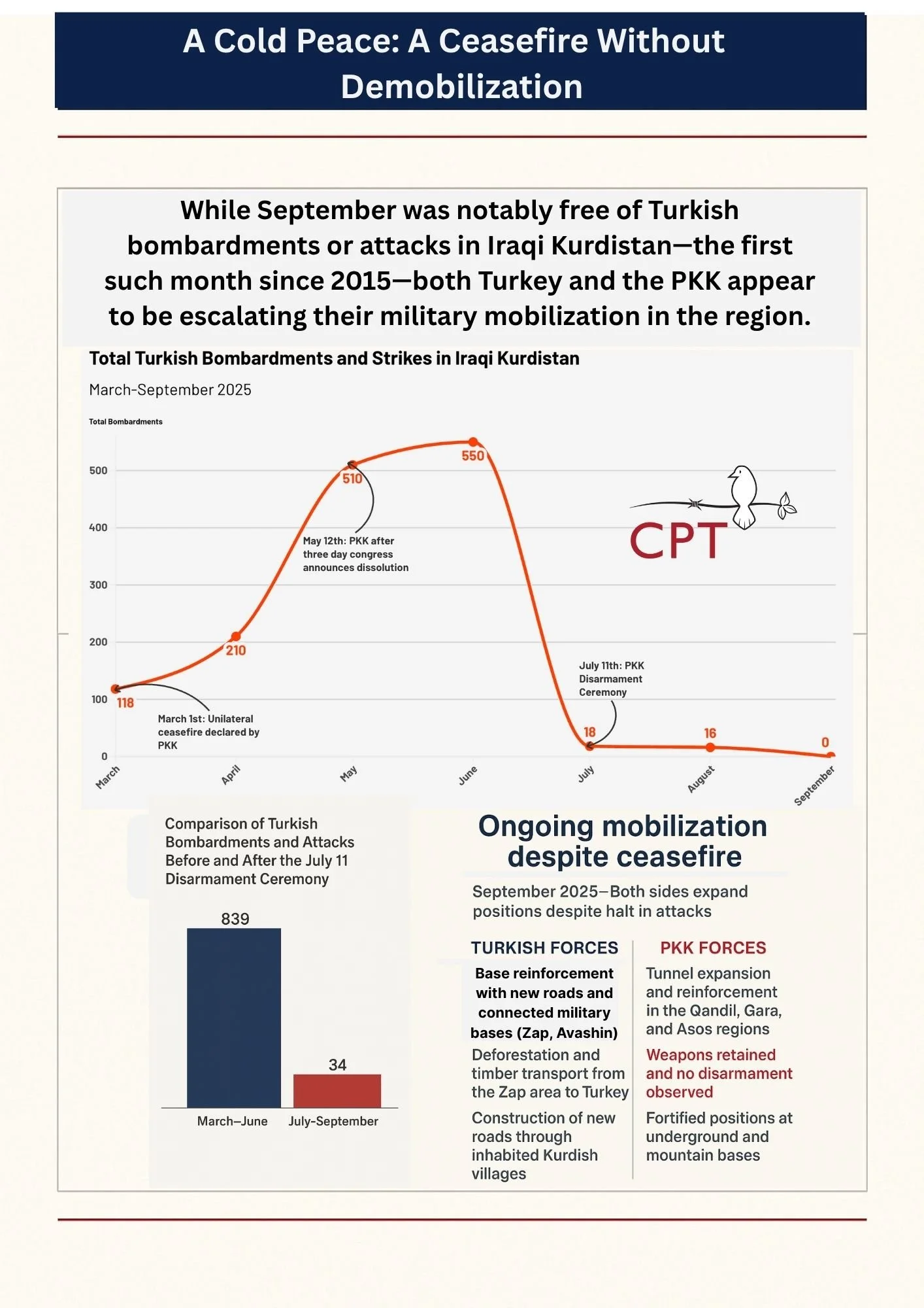 It has been seven months since the Kurdistan Workers’ Party (PKK) announced a unilateral ceasefire, and over three months since it held a symbolic ceremony to initiate the disarmament process. With peace negotiations and implementation efforts now entering deeper phases of discussion, September marked the first month since the last peace process in 2015 without any bombardments or attacks by the Turkish Armed Forces in Iraqi Kurdistan—continuing the sharp downward trend observed in July and August, which saw a 97% reduction in attacks. Despite this progress, and although bombardments and attacks have significantly decreased, military mobilization by both sides has continued to increase.